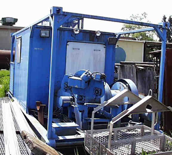 | Skagit, protable tow winch | Skagit BU-125 single drum portable Tow Winch or dock winch. w/capstan, FD, BB, DD, drum size 24"x19"x13" will hold 1,250ft of 1 1/4" wire, 4 1/4"shafts and 4 1/2" gear width, 16 to 88 teeth. 58,000lb line pull. Electric drive, 50hp 440v AC 3ph, 900rpm GE slip ring motor, marine enclosure and SqD motor starter,Frame mounted tow bit, 114" long, 86" wide, 74" tall, reconditioned, but now weathered (of21) Weighs 12,000 lbs. |