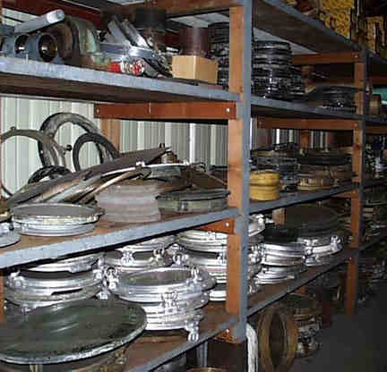 | port hole, Alum | Complete assembly 16" diameter glass, aluminum frame, 21" outside diameter, 2 dog, qty 3ea w/beveled edge & 1ea w/straight edge, 20lbs. used, some painted some frozen dogs or frozen hinge, one missing dog (is) | $200 each | |