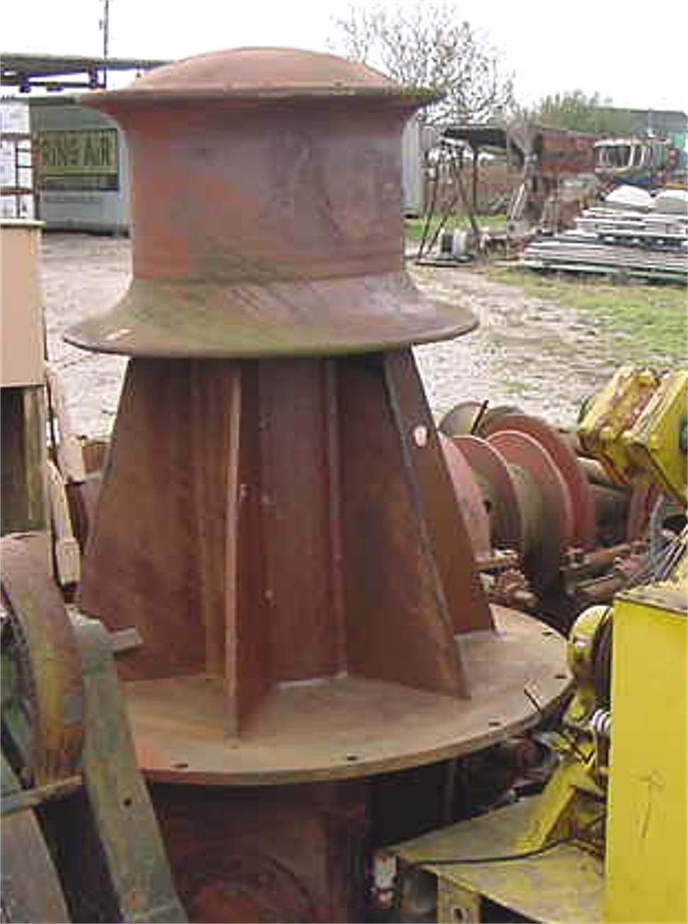 | Markey | Vertical shaft windlass and capstan, 1 1/8" chain wildcat, gypsy is 29" x 26" w/32" flange diameter, 4" shaft, through hull drive, no reduction gear, missing gear parts in the top under cover, Overall 52" tall, 54" bottom flange diameter, WWII era hardware, would be a great landscaping center piece, Industrial Art work, (of6) | $2,500 | |