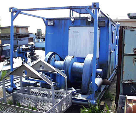 | Skagit, protable tow winch | Skagit BU-125 single drum portable Tow Winch or dock winch. w/capstan, FD, BB, DD, drum size 24"x19"x13" will hold 1,250ft of 1 1/4" wire, 4 1/4"shafts and 4 1/2" gear width, 16 to 88 teeth. 58,000lb line pull. Electric drive, 50hp 440v AC 3ph, 900rpm GE slip ring motor, marine enclosure and SqD motor starter,Frame mounted tow bit, 114" long, 86" wide, 74" tall, reconditioned, but now weathered (of21) Weighs 12,000 lbs. |